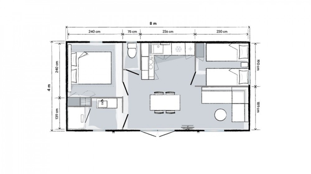 L’O´Hara pour 4 personnes est équipé avec deux chambres à coucher, une salle de bains avec toilette, d’une cuisine équipée et d’une salle de séjour. La cuisine contient tout ce dont vous avez besoin: ustensiles de cuisine, vaisselle, machine à café à filtre, four à micro-ondes, bouilloire etc. Les chambres à coucher sont équipées avec des coussins et couvertures. Les draps ainsi que des lits-bébé et chaises pour enfants sont possible de louer chez nous. Réservez-les en avance pour en profiter directement dès votre arrivée.