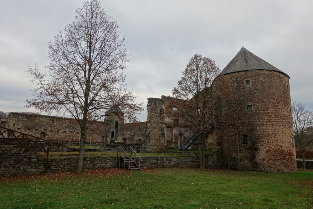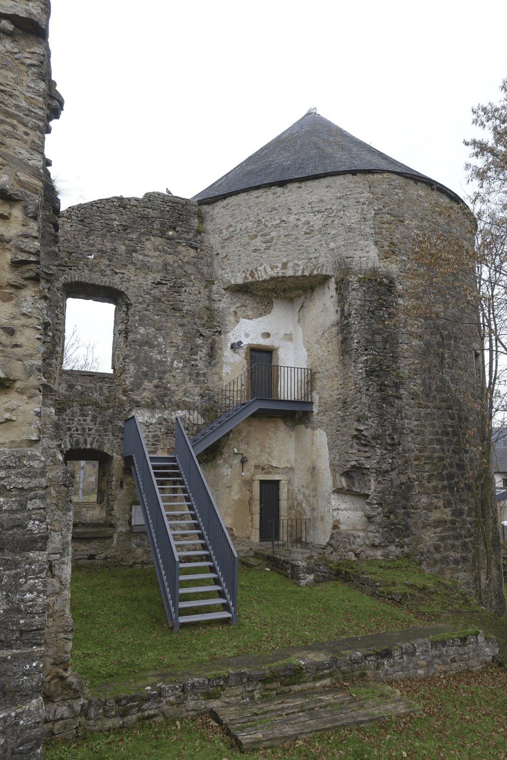 Haut de 21 m, long de 17 m et large de 13 m, l’ancien donjon est la tour d’habitation la plus imposante du Luxembourg. En 1292 est mentionné un certain „Ferri von Schönfels“. L’entrée est décorée avec les armoiries de la famille Schloeder von Lachen.