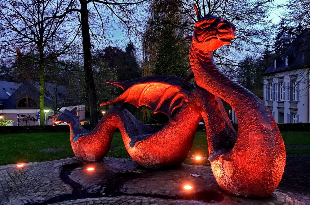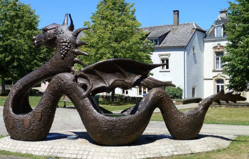 Les trois bassins qui font partie de la sculpture du dragon symbolisent les rivières Alzette, Mamer et Eisch. Les onze armoiries rappellent le statut de Mersch comme capitale cantonale. Les sept bosses représentent les sept châteaux de la vallée de Mersch. Sur la tête du dragon, des raisins rappellent le fait que les Romains avaient apporté le raisin à Mersch ; comme le rappelle d’ailleurs aussi le toponyme « am Wangert » (au vignoble).